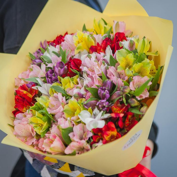 Альстромерия розовая – 10 шт.Альстромерия красная – 10 шт.Альстромерия желтая – 9 шт.Упаковка крафт – 1 шт.Атласная лента – 1 шт.