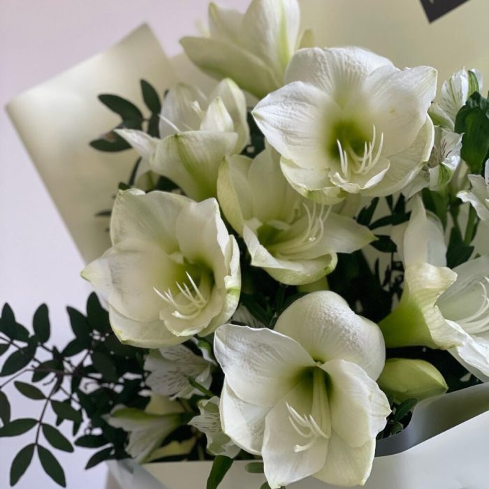 Альстромерия – 2 шт.Фисташка пучок – 2 шт.Дизайнерская упаковка – 1 шт.амариллис микс – 3 шт.