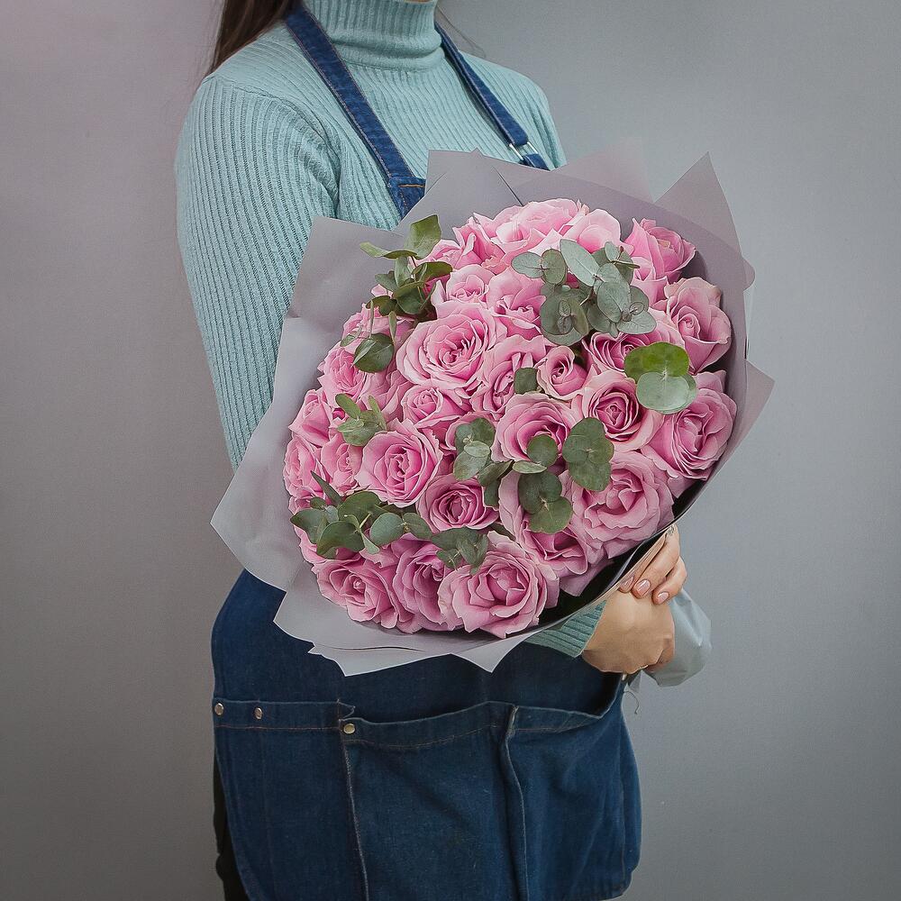 Эвкалипт – 1 шт.розы – 35 шт.дизайнерская упаковка и атласная лента – 1 шт.