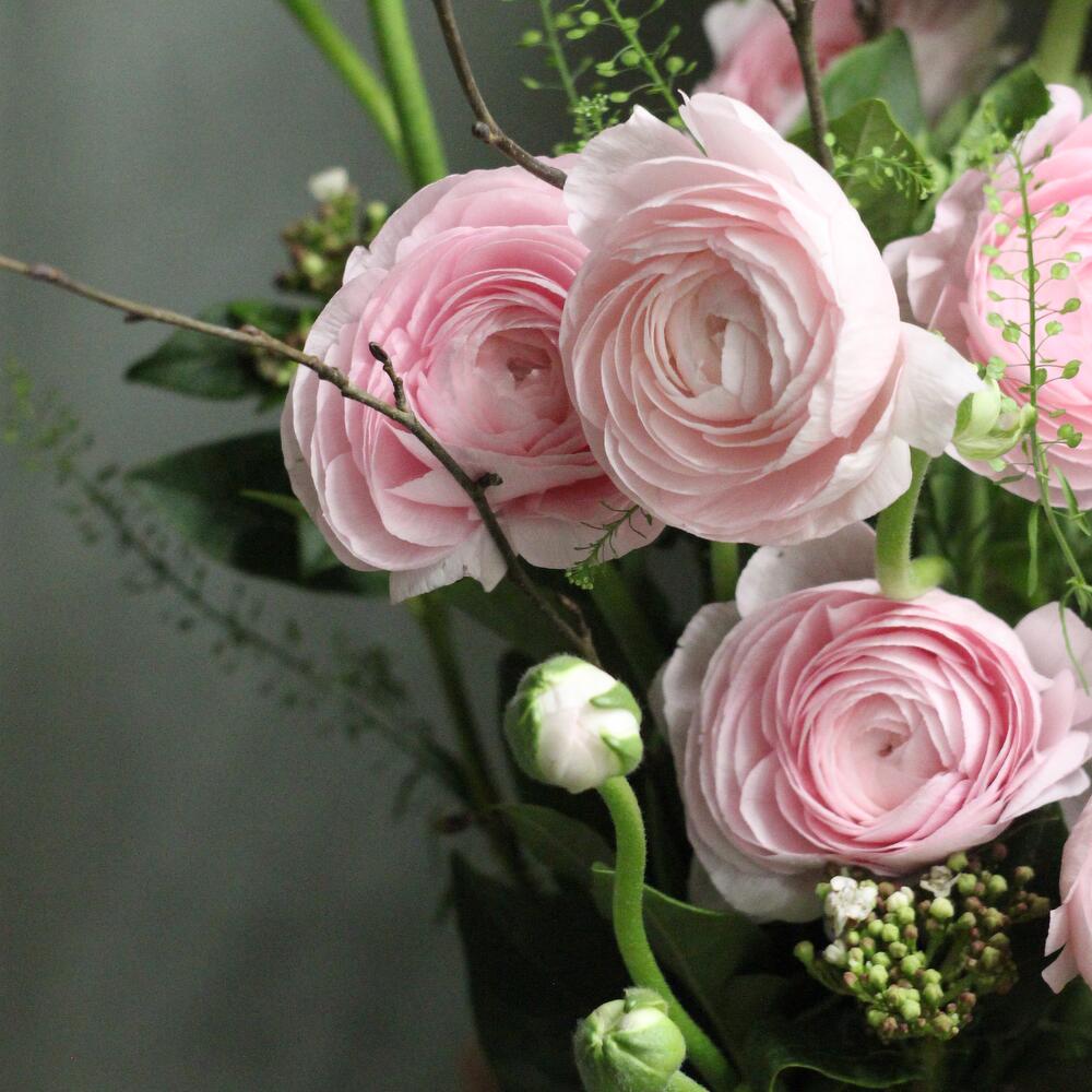 Букет с нежными ранункулюсами, ирландскими колокольчиками, ветвями и пастушьей сумкой.