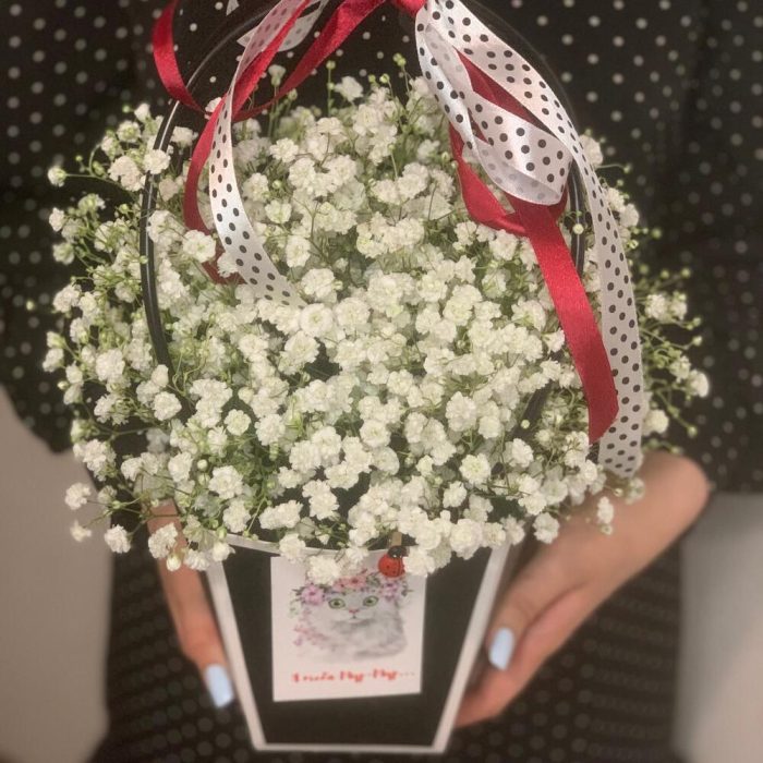 Гипсофила – 5 шт.Атласная лента – 2 шт.Оазис флористический – 1 шт.Сумочка с ручками из плотного картона ламинированого – 1 шт.