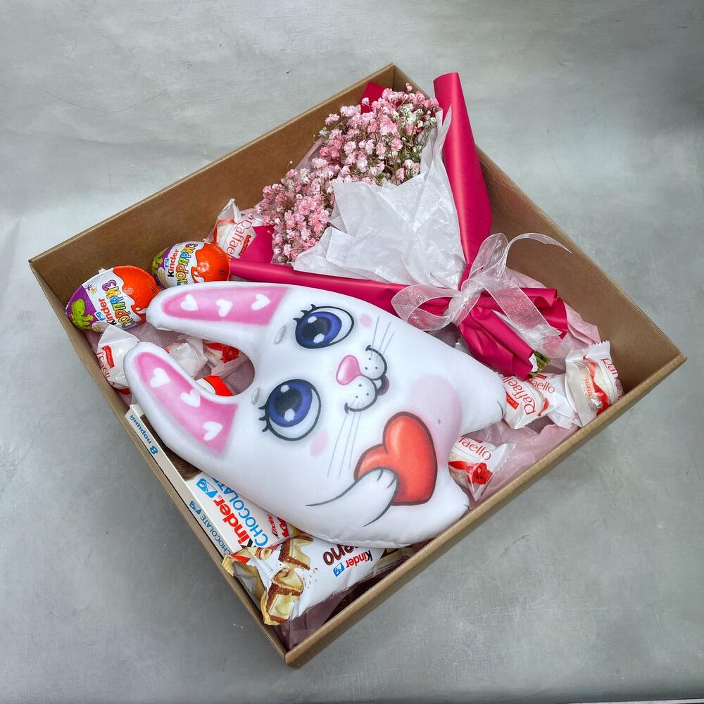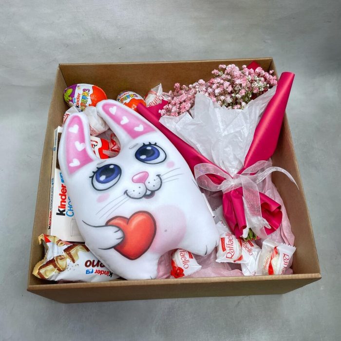 Гипсофила – 3 шт.Упаковка – 1 шт.Kinder bueno – 1 шт.Kinder сюрприз – 2 шт.Kinder chocolate – 1 шт.коробка крафт с окошком – 1 шт.игрушка заяц-антистресс – 1 шт.
