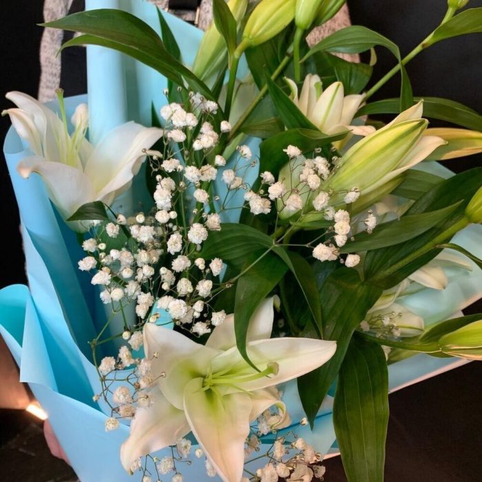 Лилия – 3 шт.Гипсофила – 1 шт.Дизайнерская упаковка – 2 шт.Атласная лента – 1 шт.