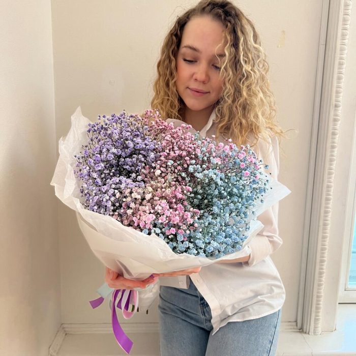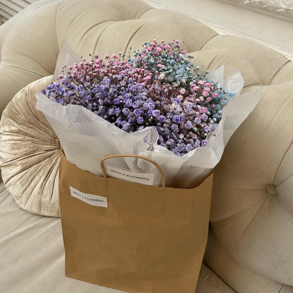 Гипсофила – 7 шт.Дизайнерская упаковка – 1 шт.Лента атласная – 1 шт.