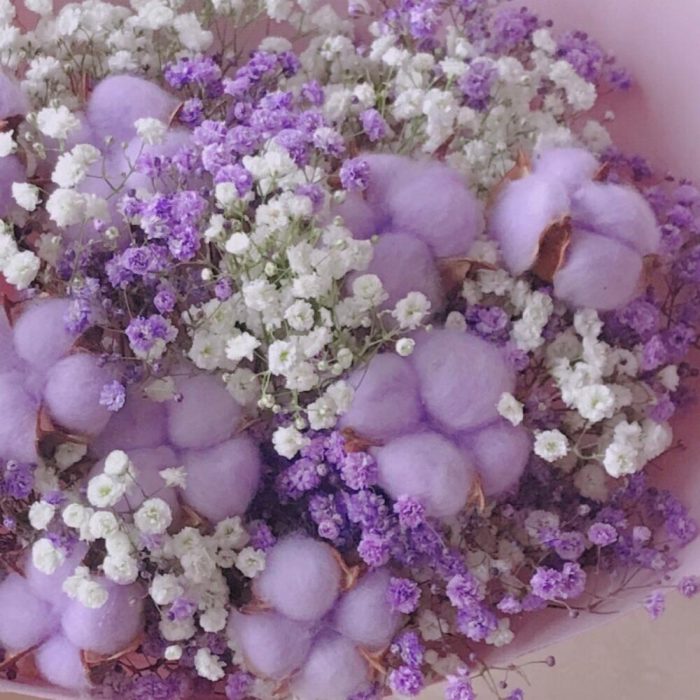 Хлопок – 9 шт.Лента атласная – 1 шт.Упаковка дизайнерская – 1 шт.гипсофила фиолетовая и белая – 5 шт.
