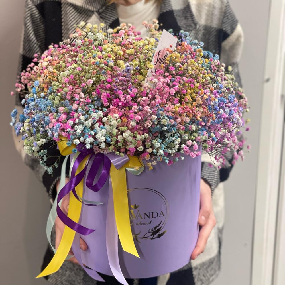 “Сиреневый туман” – композиция из гипсофилы в шляпной коробке