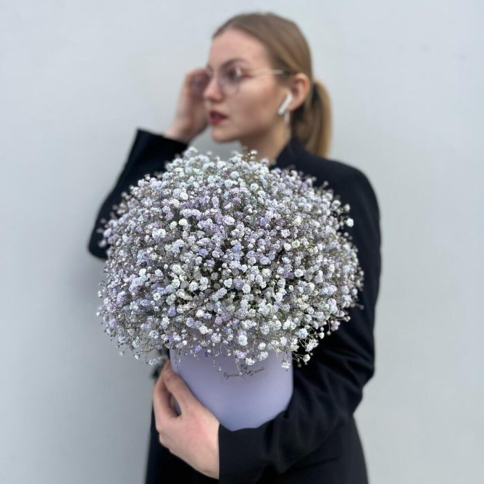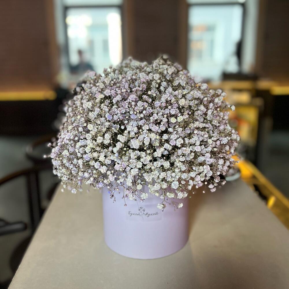 “Сиреневый туман” – композиция из гипсофилы в шляпной коробке