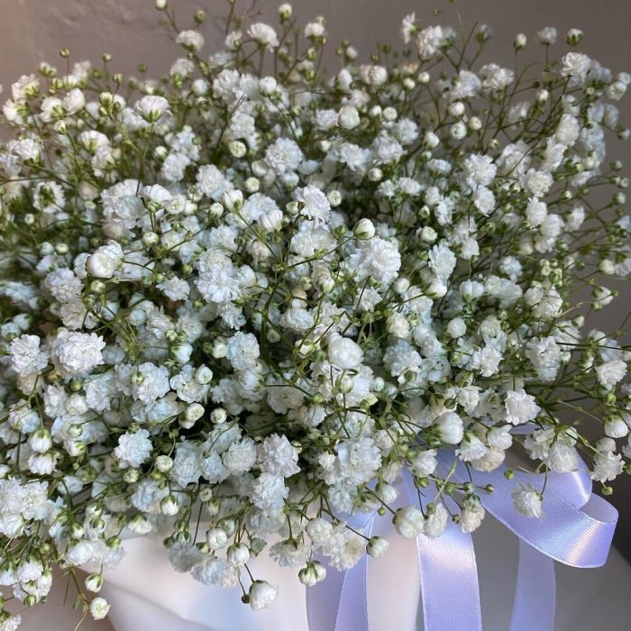 гипсофила белая – 5 шт.Упаковка дизайнерская – 2 шт.Лента атласная – 2 шт.открытка для пожеланий – 1 шт.
