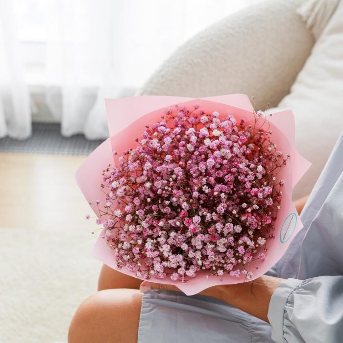 гипсофила цветная – 5 шт.Пленка корейская – 2 шт.Лента атласная – 1 шт.