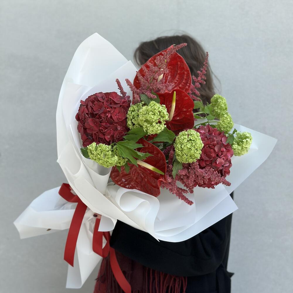 Гортензия – 2 шт. Антуриум – 3 шт. Вибурнум – 3 шт. Астильба – 3 шт.