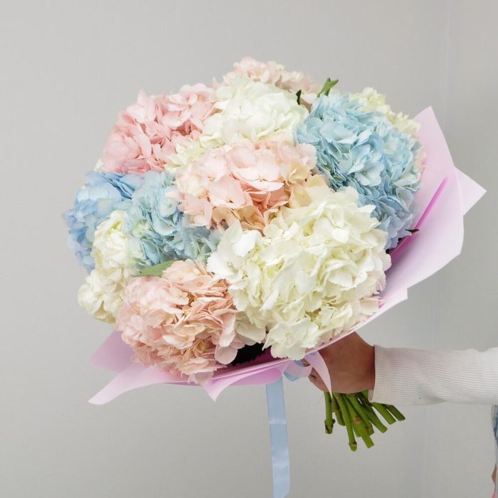 Гортензия – 15 шт.Лента атласная – 2 шт.Фоамиран (упаковка) – 2 шт.подкормка для срезанных цветов – 1 шт.инструкция по уходу за цветами – 1 шт.