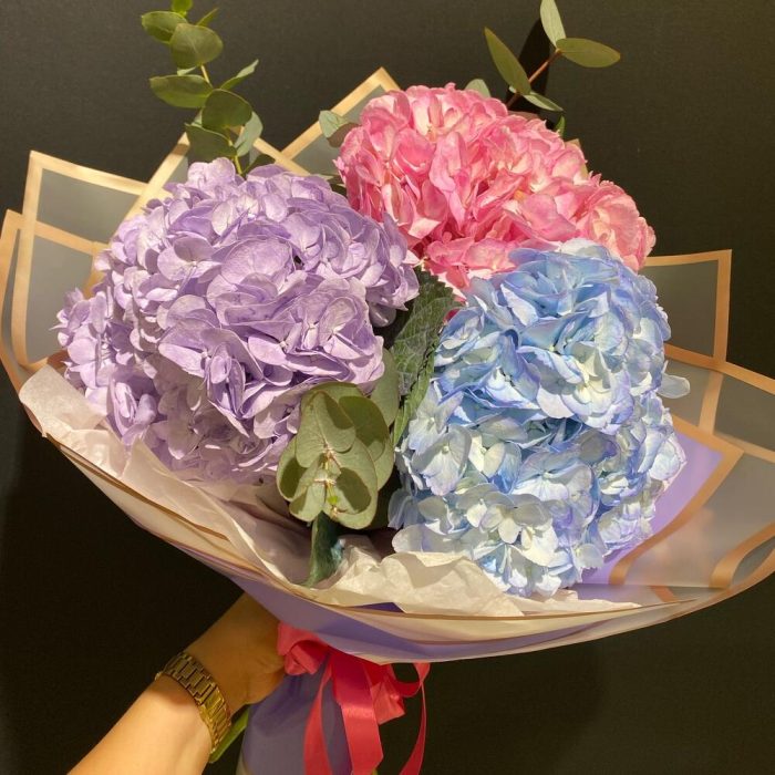 Гортензия – 3 шт. Эвкалипт – 4 шт. Лента атласная – 3 шт. Тишью – 2 шт. Слюда упаковка – 2 шт. салфетка декоративная – 4 шт.