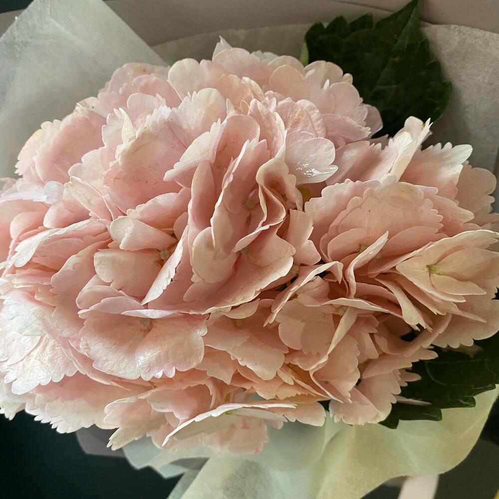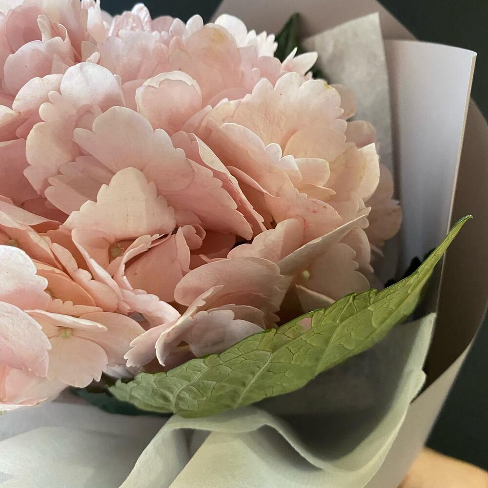 Гортензия очень любит воду и влажность, поэтому воды должно быть налито вплоть до листьев у соцветий. Стебель нужно разрезать секатором/ножом на 2-3 части. Раз в 2 дня подрезайте стебель на 1 см и опрыскивайте соцветия водой,гортензия очень водолюбивая.Не ставьте гортензии под прямые солнечные лучи и в очень жарком месте ( например, у батареи, крайне противопоказано любым срезанным цветам). Лучше поставить в какое нибудь прохладное место, или например на ночь приоткрывать окно.Букет оформлен в корейском стиле,что придает необычный образ букету.
