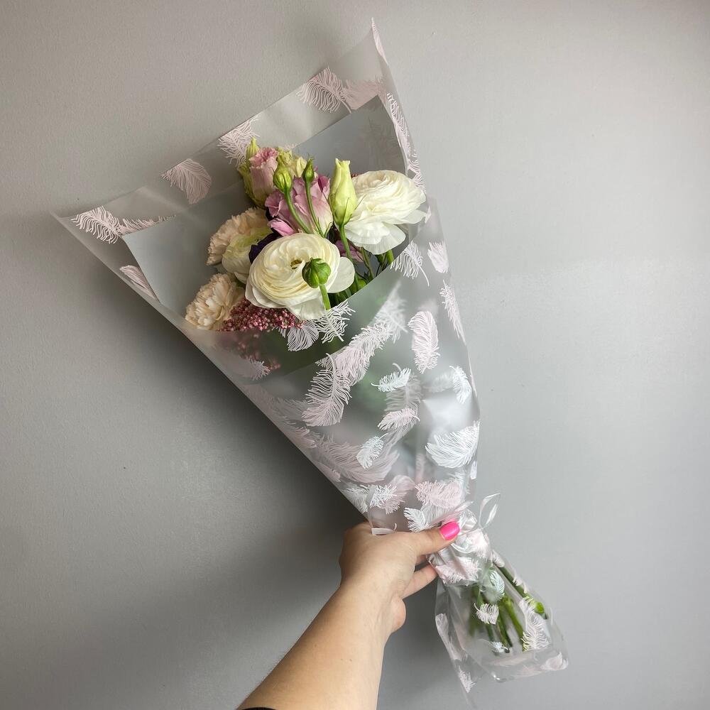 Ранункулюс – 3 шт.Гвоздика одноголовая – 3 шт.Анемон – 1 шт.Лизиантус – 1 шт.озатомнус – 2 шт.Упаковка дизайнерская – 1 шт.