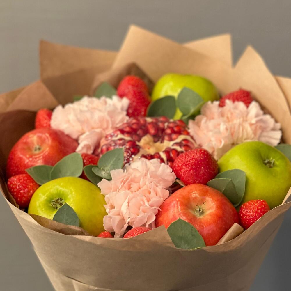 Клубника – 11 шт.Лента атласная – 1 шт.Диантус – 3 шт.Стильная упаковка – 3 шт.зелень декоративная – 9 шт.гранат красный – 1 шт.яблоки зеленые – 3 шт.яблоки красные – 2 шт.работа флориста – 1 шт.прозрачная пленка упаковочная – 1 шт.