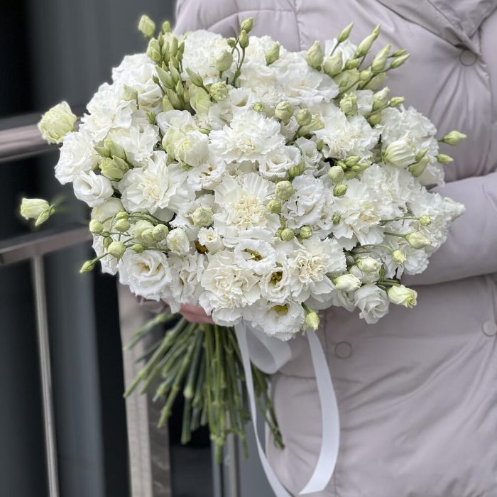 Букет оформленный под ленту из белых гвоздик и кружевной эустомы!