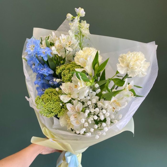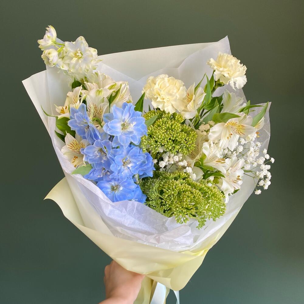 Дельфиниум голубой – 1 шт.Альстромерия – 3 шт.Диантус сортовой – 3 шт.Седум – 2 шт.гипсофила белая – 1 шт.Упаковка дизайнерская – 1 шт.Открытка мини – 1 шт.инструкция по уходу за цветами – 1 шт.уходовое средство для цветов – 1 шт.