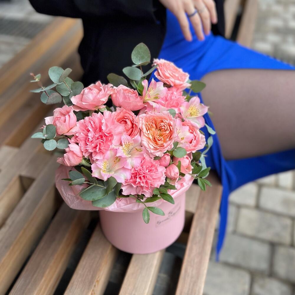 Альстромерия – 1 шт.Эвкалипт – 1 шт.Тишью – 2 шт.Диантус – 3 шт.Коробка шляпная – 1 шт.Роза пионовидная кустовая – 2 шт.Фисташка – 1 шт.