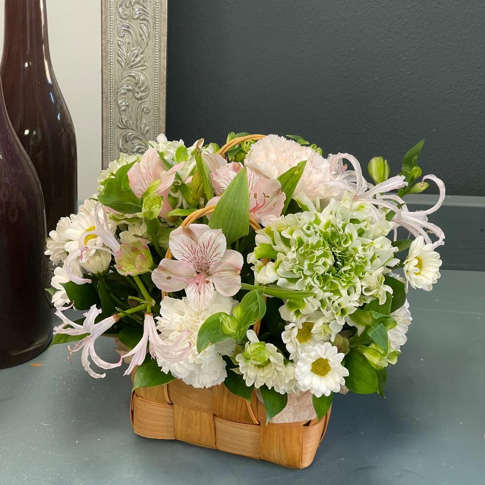 Альстромерия – 3 шт.Гвоздика – 3 шт.Сантини – 4 шт.Ранункулюс – 2 шт.Лукошко – 1 шт.Нерина – 2 шт.