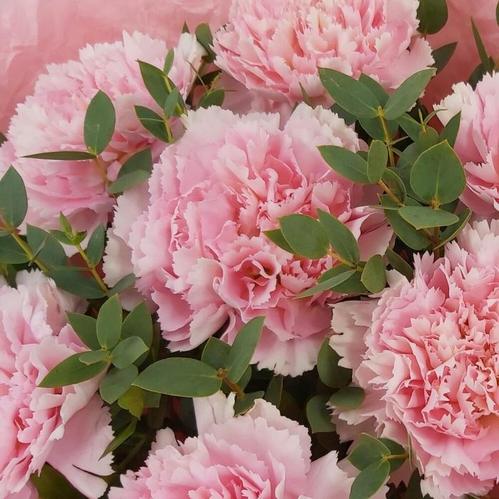 Нежный и стойкий букет из сортовых розовых динтусов и эвкалипта в стильной упаковке в тон. Такой букет всегда уместен и подойдёт для любого повода: День Рождения, именины, годовщина свадьбы, рождение ребенка, 8 марта, День Святого Валентина, выпускной и т.д. Можно вручить маме, сестре, подруге, коллеге, учителю, любимой.