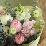 Ранункулюс – 2 шт.Львиный зев – 1 шт.Маттиола – 1 шт.Диантус – 3 шт.Твидия – 2 шт.тмин – 2 шт.Сантини – 1 шт.лигуструм – 1 шт.Эвкалипт – 1 шт.Упаковка – 1 шт.
