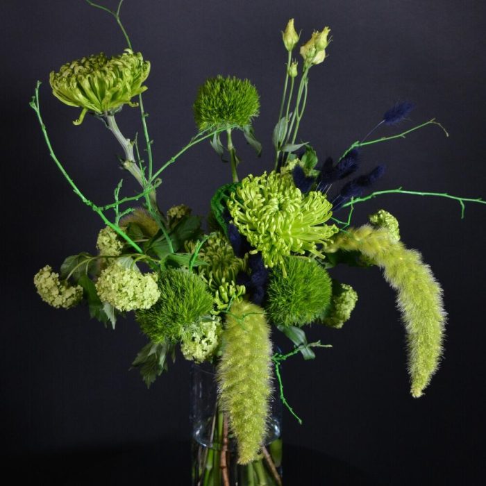 Хризантема – 4 шт.Гвоздика – 4 шт.Вибурнум – 2 шт.Сетария – 3 шт.ветки декоративные – 2 шт.Лагурус – 7 шт.Лотос – 1 шт.