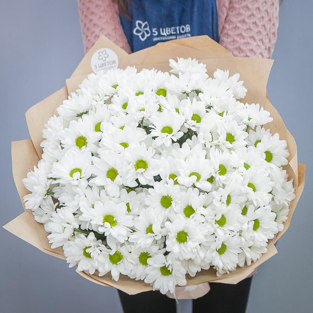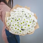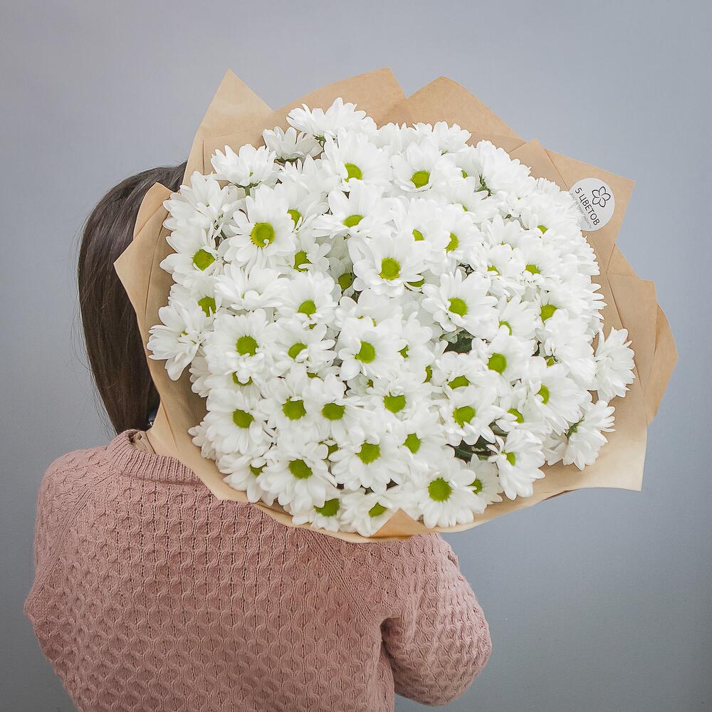 хризантемы – 15 шт.дизайнерская упаковка и атласная лента – 1 шт.