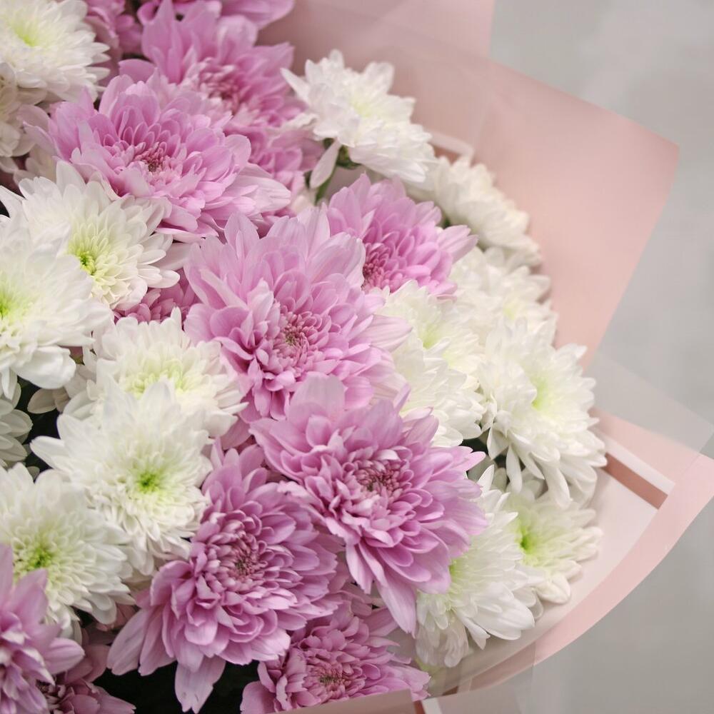 Букет из 15 кустовых хризантем нежный микс в стильной упаковке
