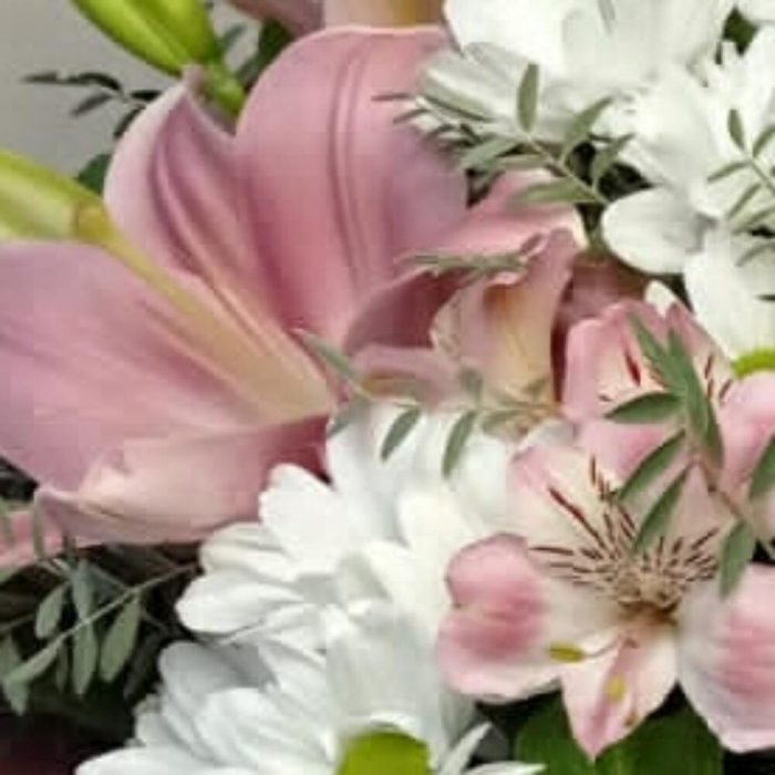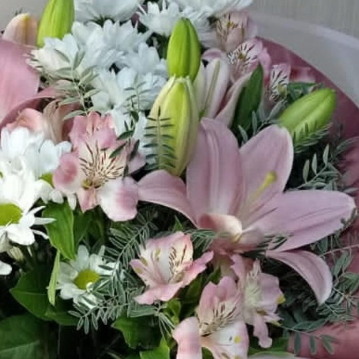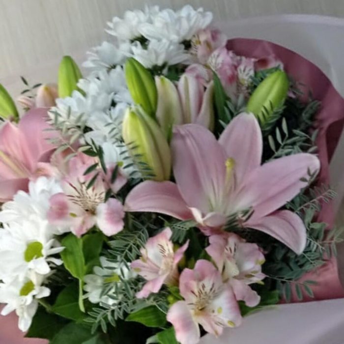 Лилия розовая – 2 шт. Хризантема кустовая ромашковая – 3 шт. Альстромерия Микс Европа – 4 шт.