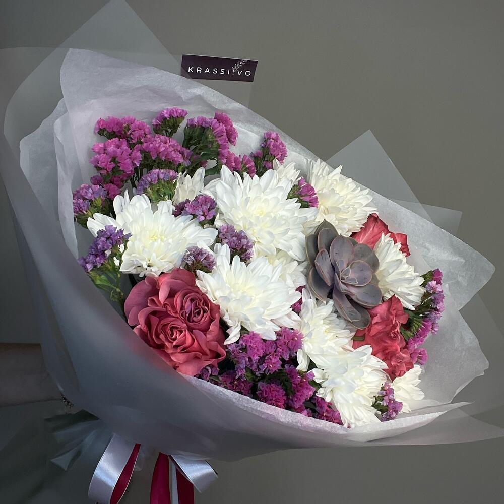 Статица – 4 шт. Хризантема кустовая – 3 шт. Суккулент – 1 шт. розы – 3 шт.