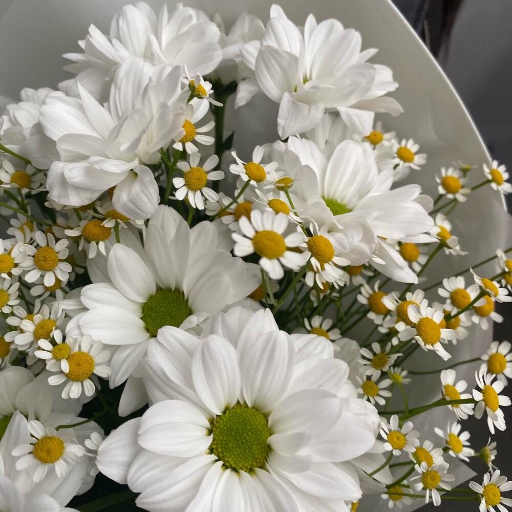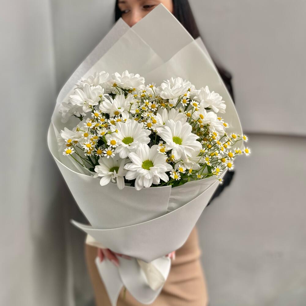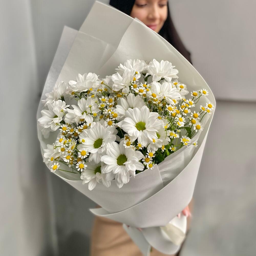 Танацетум – 4 шт.Лента атласная – 2 шт.Хризантема кустовая ромашка – 3 шт.Упаковка дизайнерская – 1 шт.