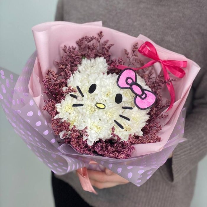 Милый необычный букет Хэллоу Китти поднимет настроение не только ребенку,но и взросломуОткрытка с вашим текстом в подарок