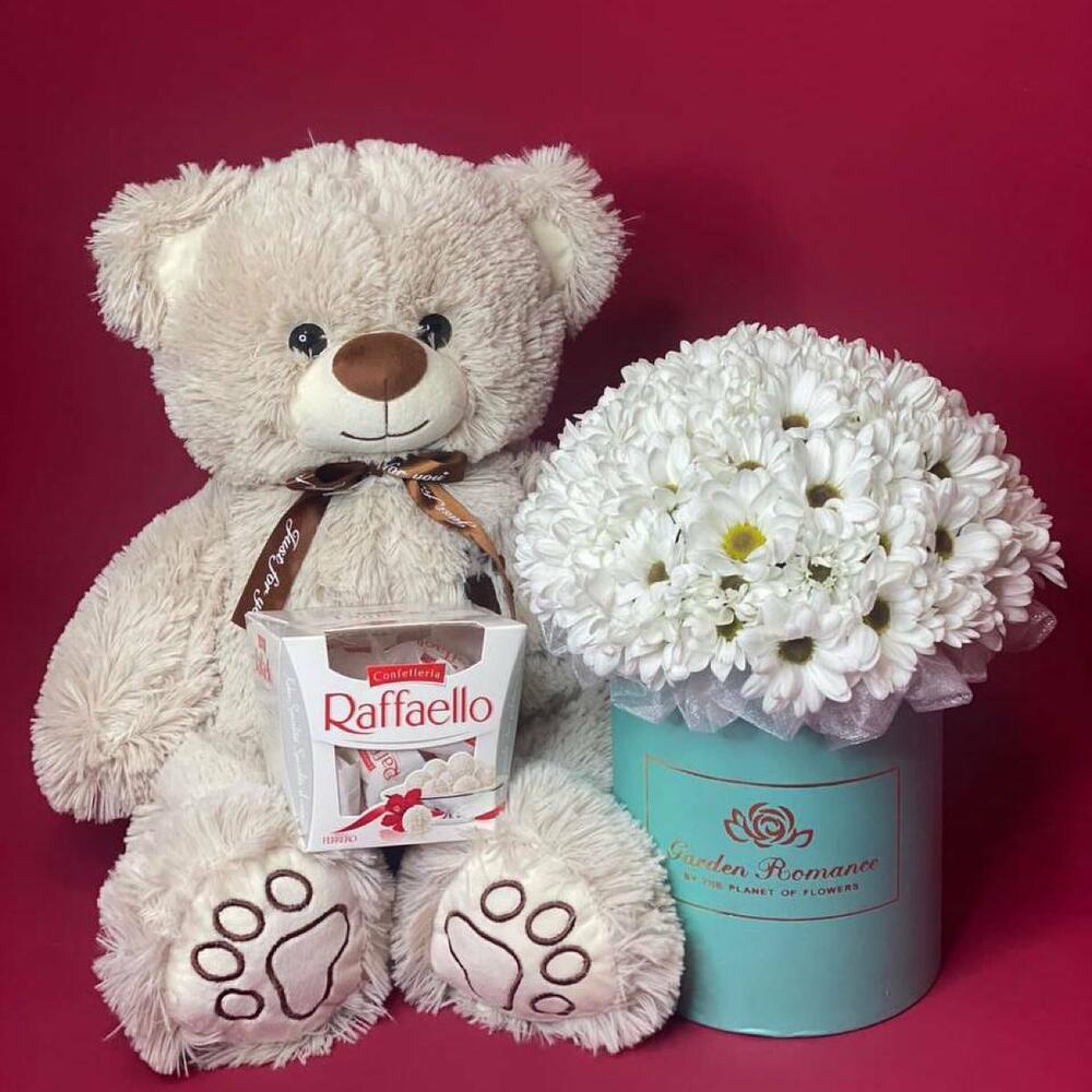 Хризантема кустовая – 5 шт.Шляпная коробка – 1 шт.Флористическая губка (оазис) – 1 шт.раффаэлло 150 гр – 1 шт.мягкая игрушка медведь 50 см – 1 шт.