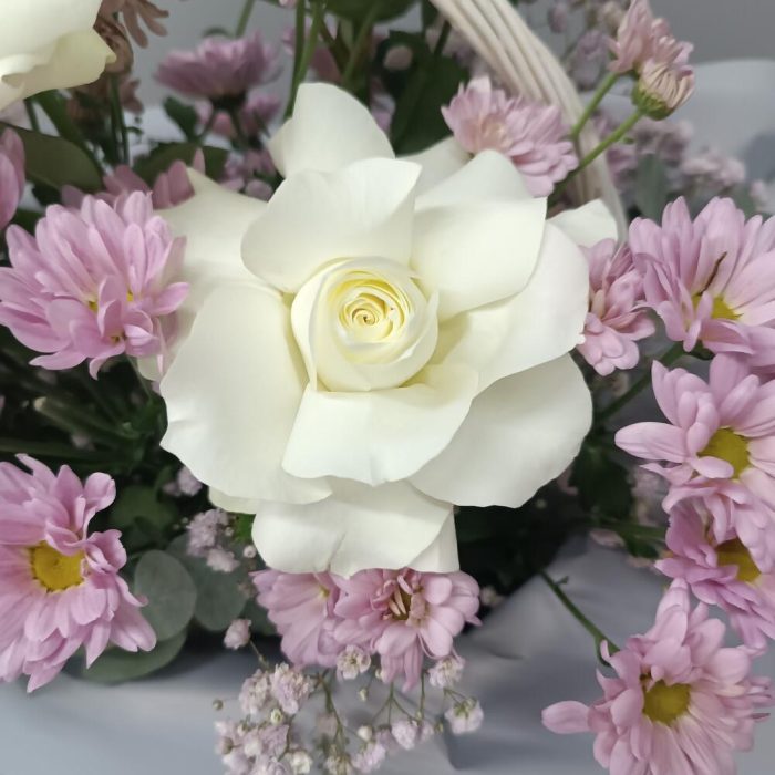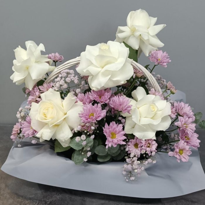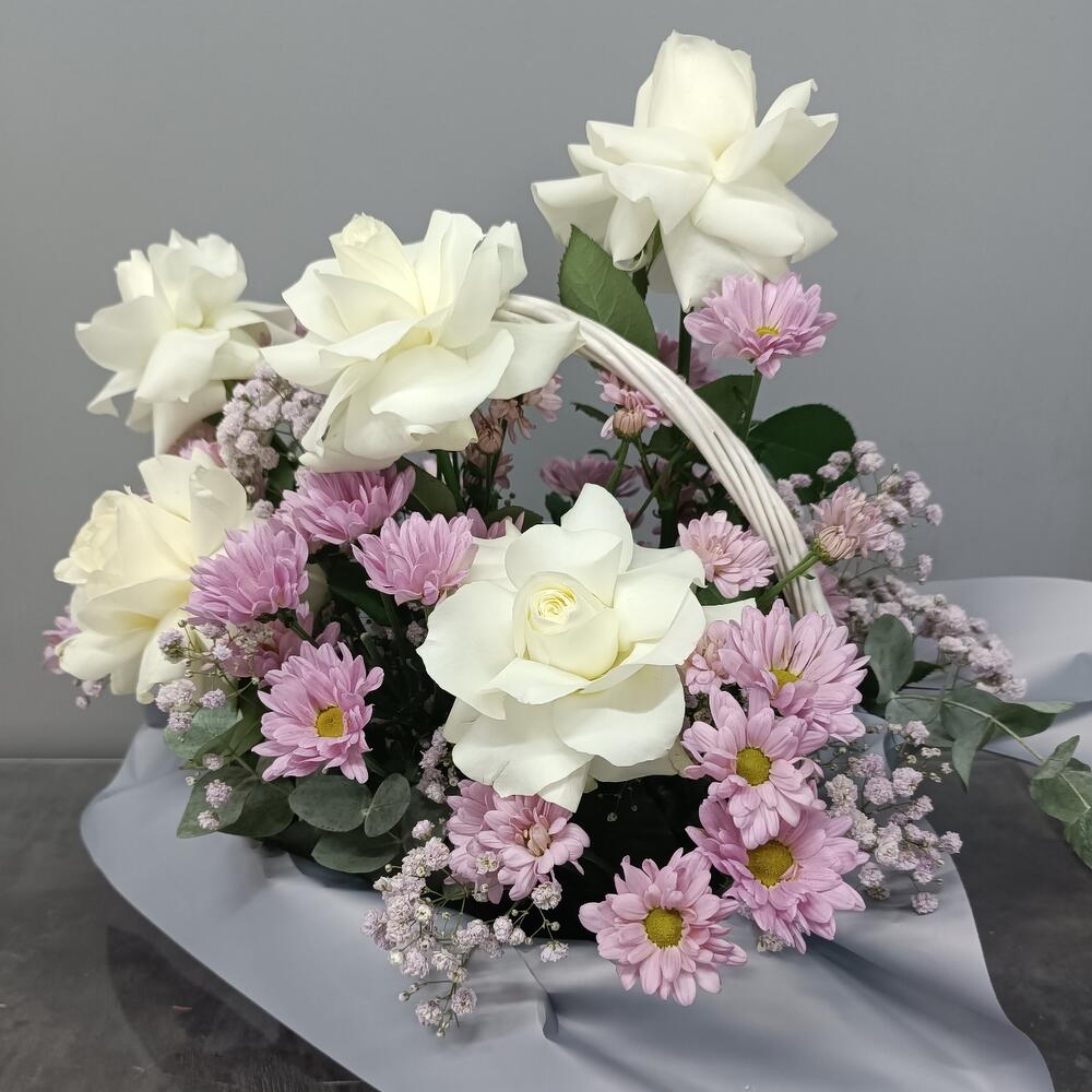 Авторская композиция из шикарных белых французских роз и ромашковых хризантем в изумительной окраске!