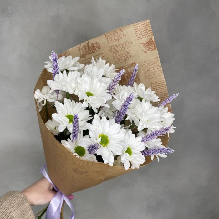 «Лавандовое созвездие» Букет из розы, гвоздики, статица и хлопка