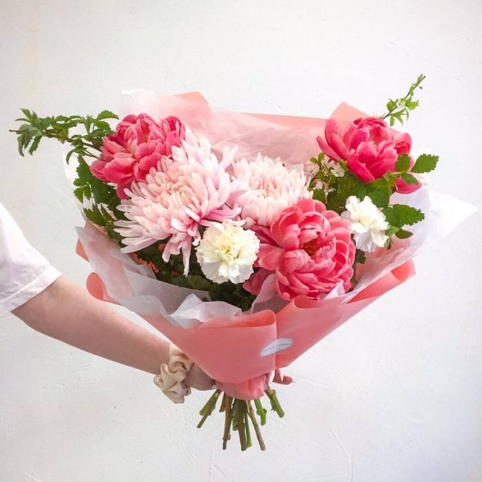 Пион Коралл Шарм (Coral Charm) – 3 шт.Лента атласная – 1 шт.Тишью – 1 шт.Фисташка – 5 шт.Корейская пленка – 3 шт.хризантема антонов крашенный – 2 шт.ветки малины с листьями – 3 шт.даинтус – 4 шт.ветки яблони цветущие – 1 шт.авкапак – 1 шт.