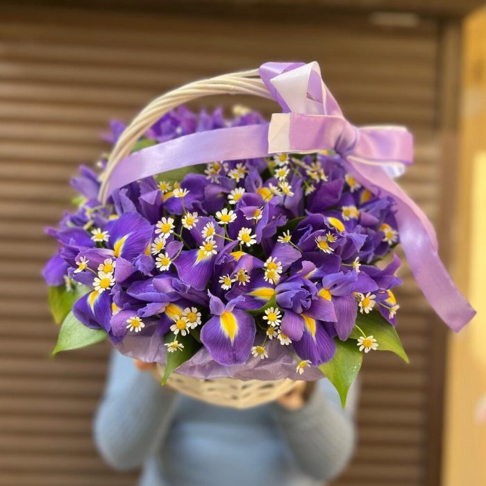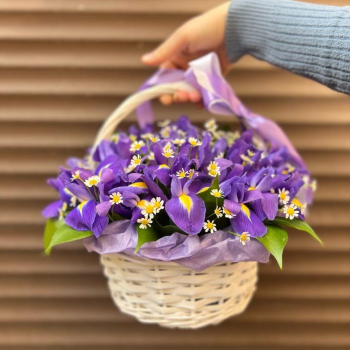 Ирис – 31 шт.Матрикария – 5 шт.Оазис флористический – 1 шт.Корзина плетеная – 1 шт.