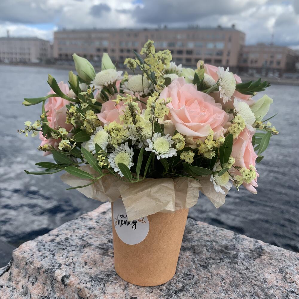 стакан крафт – 1 шт.Губка флористическая – 1 шт.Роза кустовая – 1 шт.Фисташка – 1 шт.Лимониум – 1 шт.Сталион – 1 шт.Альстромерия – 1 шт.Тишью – 1 шт.