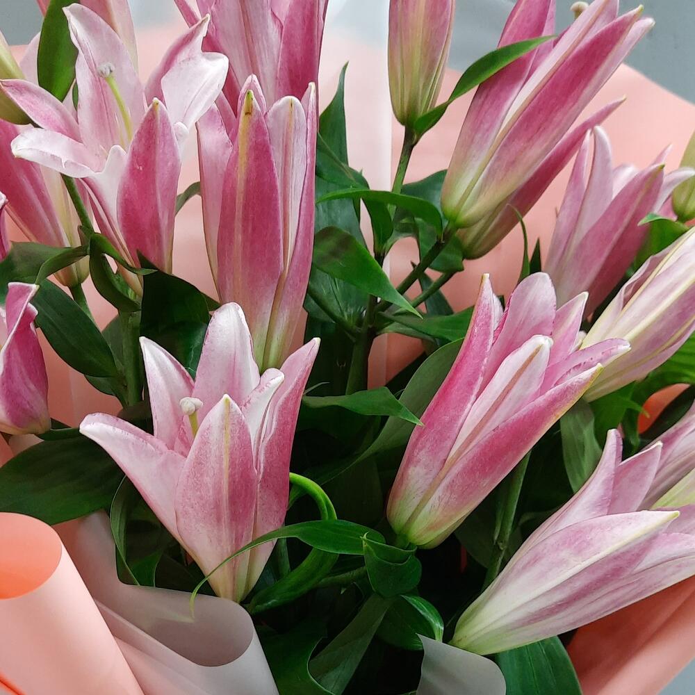 Лента атласная – 2 шт.Упаковка дизайнерская – 5 шт.лилия розовая ароматная – 5 шт.