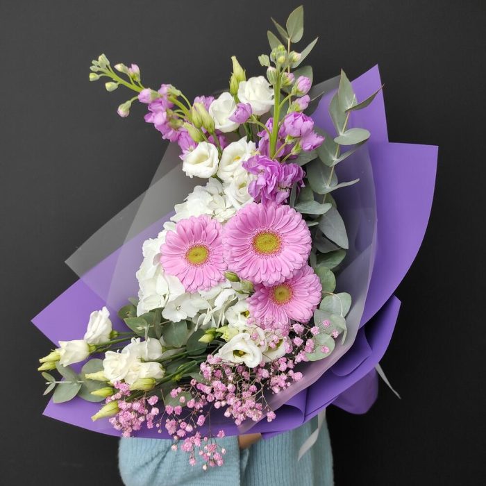 Гербера – 3 шт.Маттиола – 2 шт.Гортензия – 1 шт.Гипсофила – 1 шт.Эустома – 2 шт.Эвкалипт – 3 шт.Пленка матовая – 3 шт.