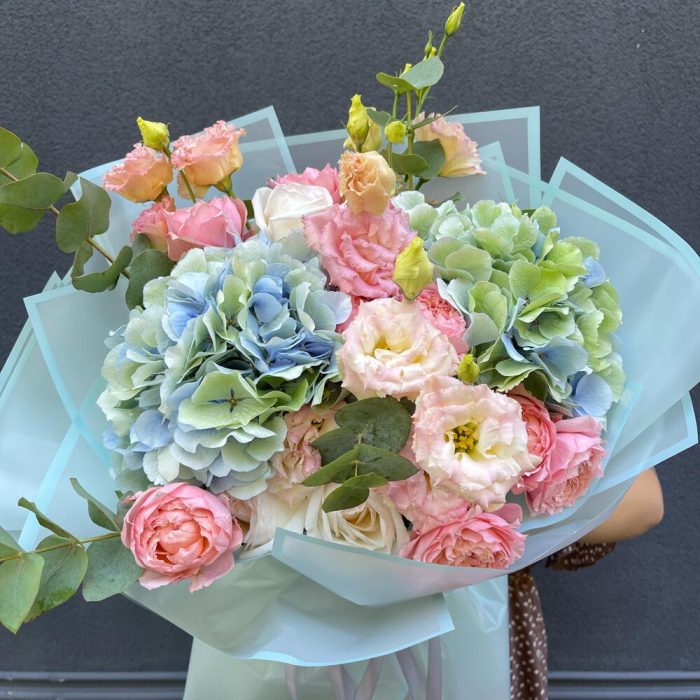 Гортензії додають об'єму та текстури, еустома принесе відтінки рожевого та білого в букеті, евкаліпт створює ароматну основу, а троянди Джульєта – надають романтичного шарму завдяки своїй ніжності та красі.