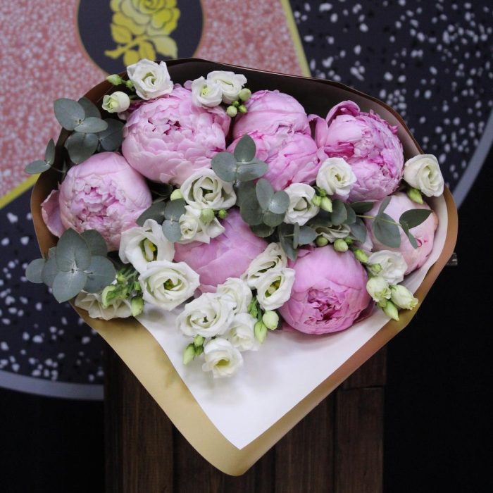 Лента атласная – 2 шт.Пион Сара Бернар – 7 шт.Пленка матовая – 2 шт.эустома белая – 3 шт.Эвкалипт Baby Blue – 3 шт.