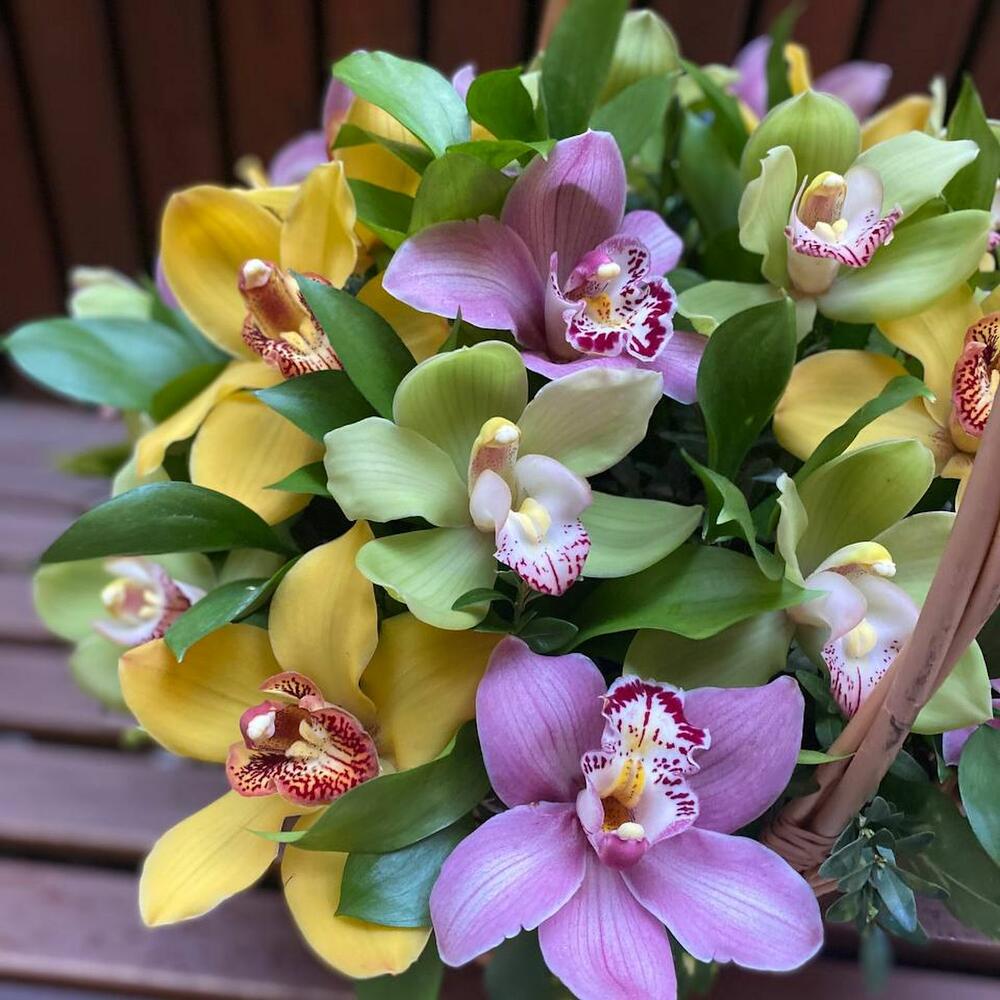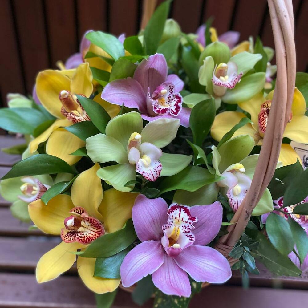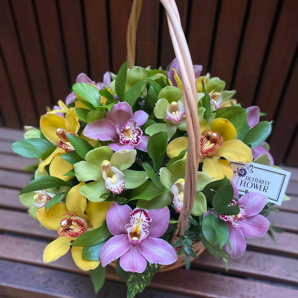 Корзина с розовыми, желтыми и зелеными орхидеями “Тропический сад орхидей”