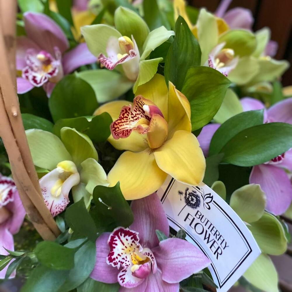 Корзина с розовыми, желтыми и зелеными орхидеями "Тропический сад орхидей"