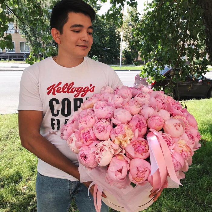 Лента атласная – 3 шт.Пион Сара Бернар – 51 шт.Оазис флористический – 3 шт.коробка шляпная xl – 1 шт.