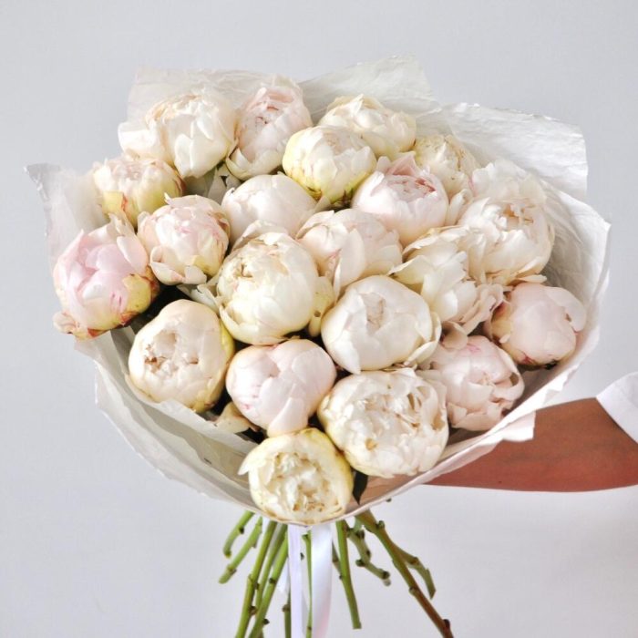 Лента атласная – 1 шт.Крафт – 3 шт.Пион белый – 21 шт.