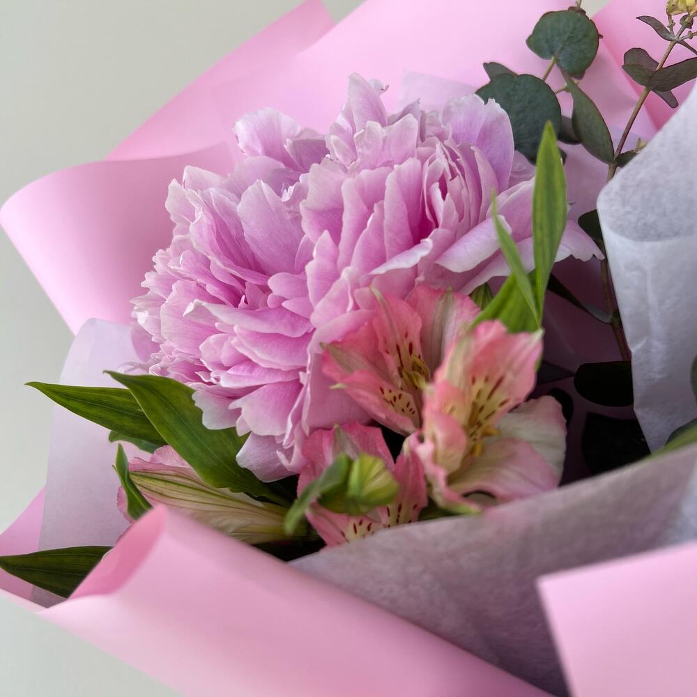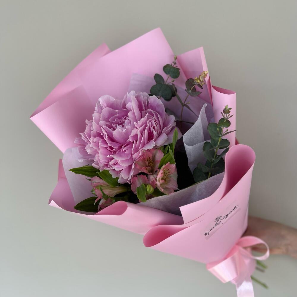 Альстромерия – 1 шт.Эвкалипт – 1 шт.Лента атласная – 1 шт.Пион Сара Бернар – 1 шт.Пленка дизайнерская – 1 шт.