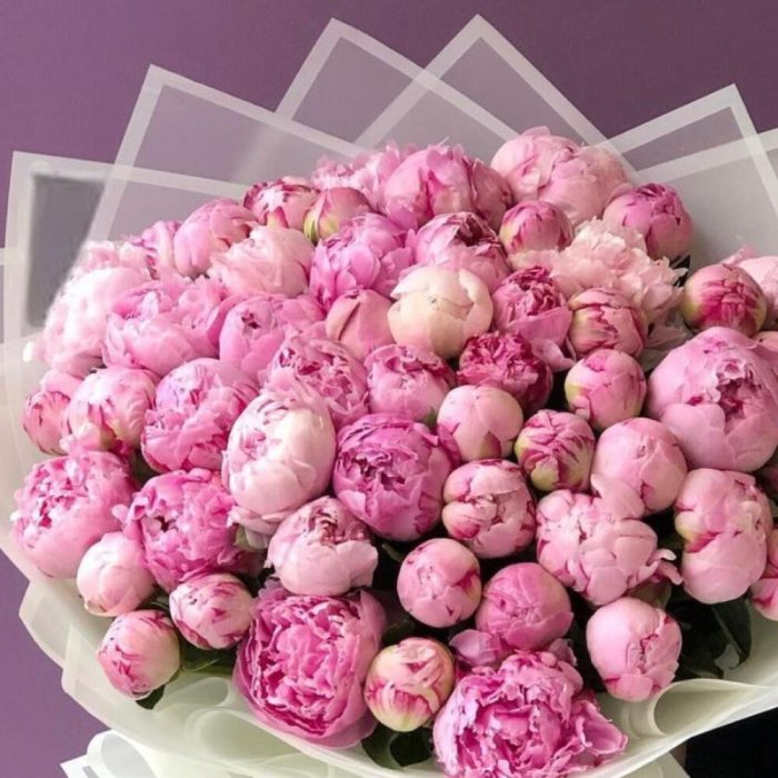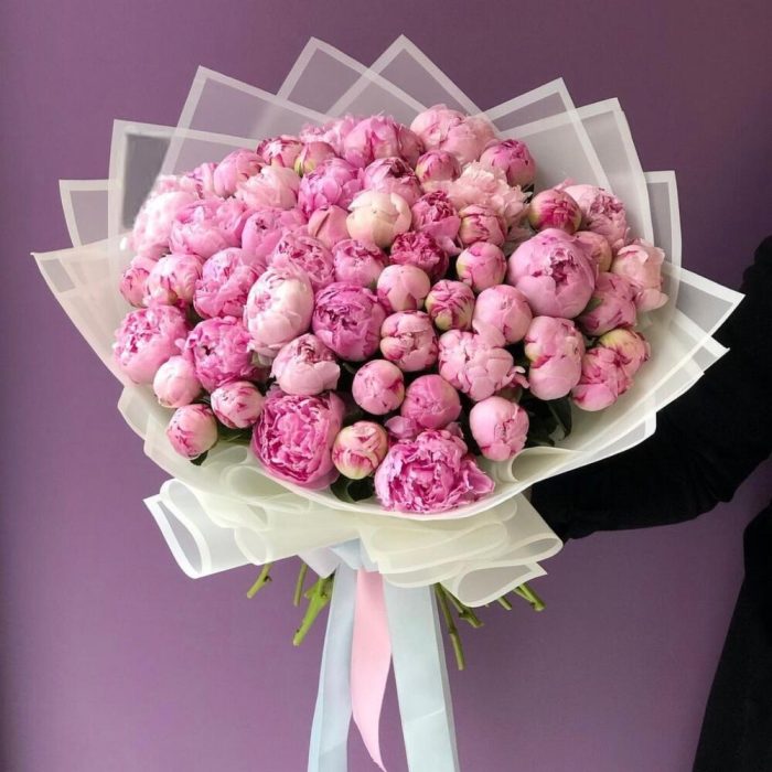 Пион Сара Бернар – 51 шт.Упаковка дизайнерская – 2 шт.Лента атласная – 2 шт.Открыточка с вашими пожеланиями – 1 шт.хорошее настроение – 100 шт.инструкция по уходу за цветами – 1 шт.коробка переноска – 1 шт.Кризал – 1 шт.