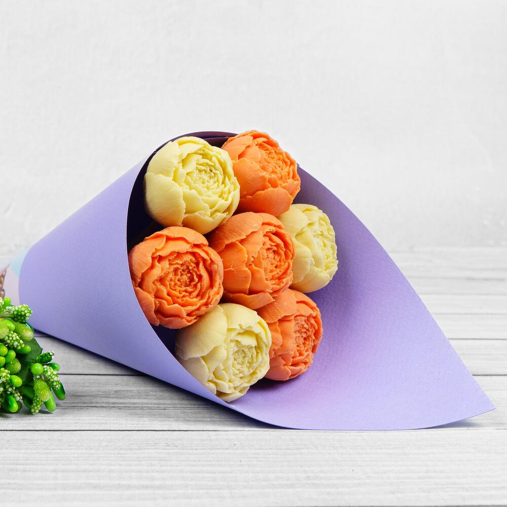 Упаковка Кулек – 1 шт.Прозрачная пленка – 1 шт.шоколадные пионы из бельгийского шоколада – 7 шт.