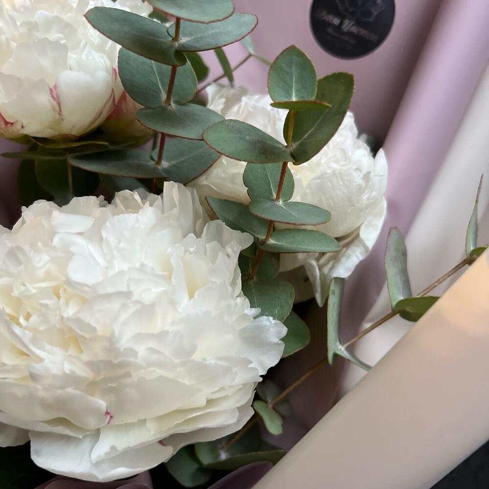 Эвкалипт – 6 шт.Атласная лента – 1 шт.декоративная упаковка – 1 шт.пионы – 3 шт.